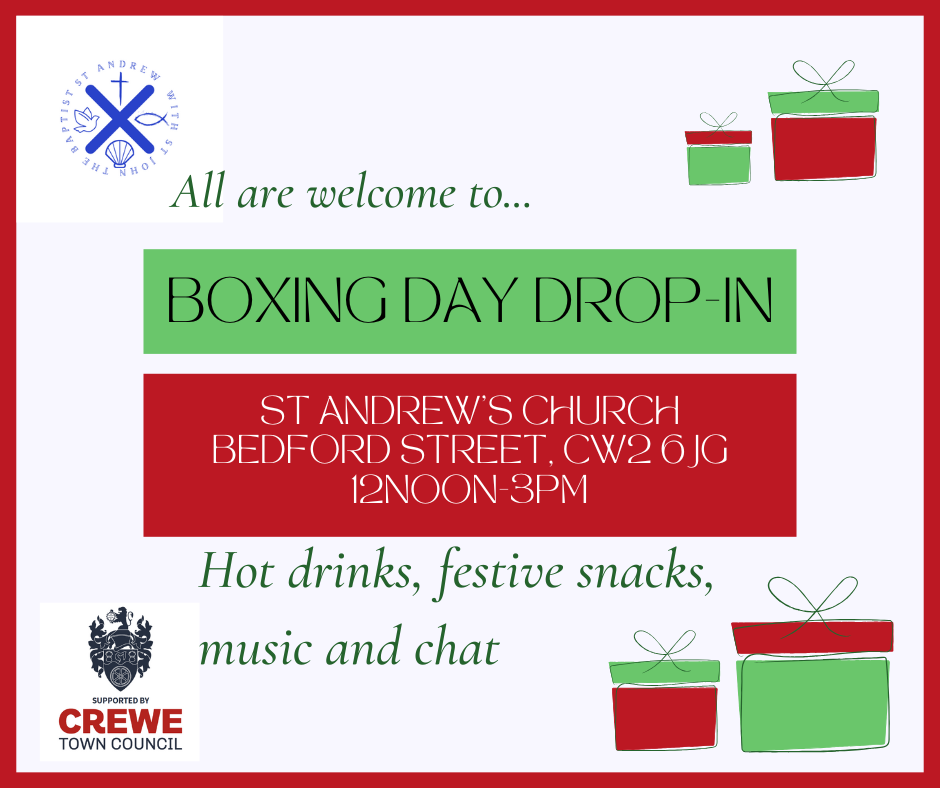 All are welcome at the Boxing Day drop-on at St Andrew’s Church, Bedford Street, Crewe, CW2 6JG, 12 noon – 3pm. Hot drinks, festive snacks, music and chat.
